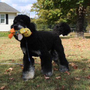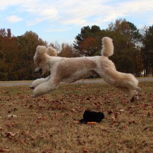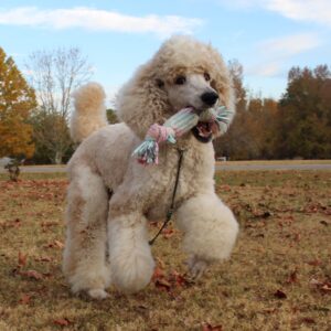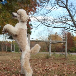 Oliver has a sweet and gentle soul. His favorite activity is to walk around the yard with his family. He has a low to medium activity level and a low chase drive. Oliver likes toys and loves to play with you. He is smart enough to believe that if you throw a ball you should get it yourself. A car ride is just as enjoyable for him as a long walk. Oliver is on the smaller size for a male poodle, the perfect companion for traveling.