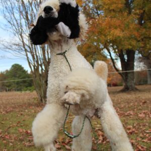 D'Artagnan is a very loyal dog. All you need to do is sweet talk him and rub his tummy and he will worship the ground you walk on. He is an enthusiastic eater but is willing to hold out for left over spaghetti should he think some will be available. He is a low to medium energy boy who loves to retrieve any toy. Rambling walks are more his style than running a marathon. Snuggling is his favorite pastime and he is great with giving poodle hugs. He is the largest poodle we have owned.